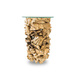 The elegant and modern Silvio Side Table is made of wood with a glass top that accentuates the unique wooden design. It has a sturdy base with a protective felt bottom to prevent scratching, making it perfect for any space in your home.